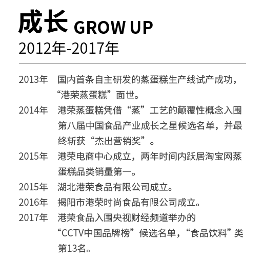 作為率先在國(guó)內(nèi)研發(fā)出蒸蛋糕的品牌,港榮食品深信產(chǎn)品是企業(yè)的根本,一直以來(lái)也致力于產(chǎn)品研發(fā)和技術(shù)創(chuàng)新。以此推出了以蒸奶香蛋糕為首的蒸系列蛋糕,更創(chuàng)新性地推出了下蒸上烤的蒸芝士蛋糕。“誠(chéng)信、健康、創(chuàng)新、時(shí)尚”是港榮的經(jīng)營(yíng)理念,也會(huì)繼續(xù)努力為廣大消費(fèi)者提供更優(yōu)質(zhì)的食品。